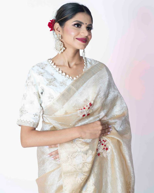 Emerald Elegance Green Crush Tissue Banarasi Saree with White Blouse