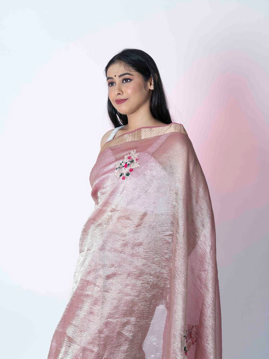Peach Glow Crush Tissue Saree with Banarasi Border